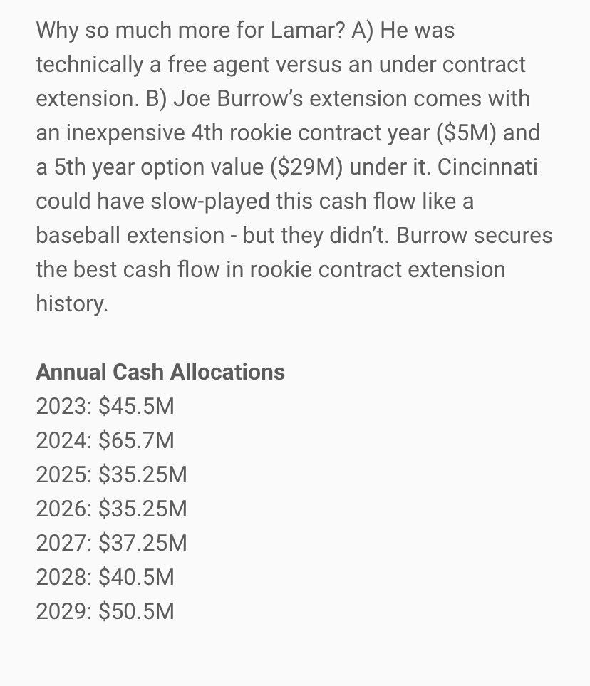 Joe Burrow signed a 5 year 275000000 contract with the Cincinnati Bengals including a 40000000 signing bonus 219010000 guaranteed and an average annual salary of 55000000. With an AAV of 55 million Burrow is the highest paid player in NFL history and he just eked by Justin Herberts contract in guaranteed money by 101 million. How does Joe Burrows new contract impact the Bengals - ESPN Full Scoreboard ESPN NFL Home Super Bowl Draft Scores Schedule Standings Stats Teams More What Burrows new. Including that bonus breakdown below are the full terms of Burrows four-year rookie contract The drop-off from Burrows rookie contract with the Bengals as the No. 2020 Draft Round 1 1 overall Bengals 2023 Salary Cap Charge..